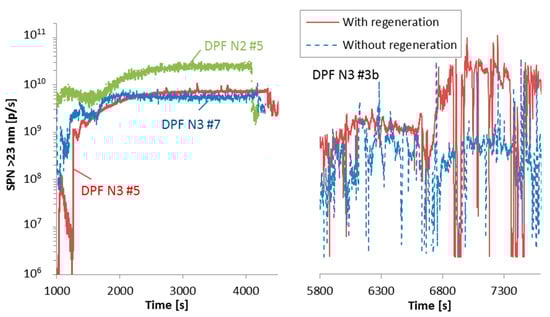 In this study, two of the vehicles (DPF N3 #4a and #5) were tested for more than one month in the laboratory and all SPN emissions were recorded (e.g., during warm-up, testing and active regeneration). The total SPN emissions divided by the total distance travelled for DPF N3#4a were 3.1 × 1011 p/km (or 2.6 × 1011 p/kWh) and for DPF N3 #5 were 6.6 × 1011 p/km (or 5.3 × 1011 p/kWh). Another vehicle that was tested for more than 1300 km, did not actively regenerate and the emissions were slightly lower than 1 × 1011 p/km. This means that the SPN emissions including the regeneration events remain at acceptable levels (i.e., close to the SPN Euro VI limit) and quite close to the values presented in Figure 2 (including the cold start).