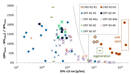 Figure 9 presents the sub-23 nm fraction of various heavy-duty vehicles in function of the SPN >23 nm emissions of the vehicles for various test cycles. Many of the measurements presented here were conducted in parallel with systems less prone to artifacts (catalytic strippers [53,67,82]), thus, the values presented should be reliable. The CNG vehicles have a high percentage (>50%) of sub-23 nm particles and one vehicle had even higher percentage at cold start (CNG N3 #1). The specific one though had <3000 km at the odometer and the contribution from the lubricant could be higher than the other vehicles [73].