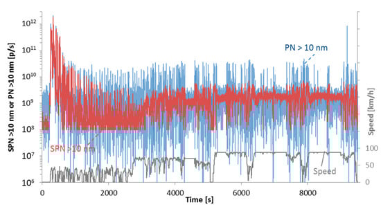 After time alignment of the signals, the SPN concentration of the system at the dilution tunnel was multiplied with the CVS flow rate, while the SPN PEMS at the tailpipe (both in the laboratory and on the road) was multiplied with the exhaust flow rate. The sum of the instantaneous particle number emissions during the urban, rural and motorway phases were divided with the respective distances to obtain the distance specific SPN emissions [p/km]. All emission events were included in the calculations (integrated emissions) and no parts were excluded as required in the regulations (e.g., <10% max power in Europe [39,43] and the Not-To-Exceed (NTE) concept in USA). When total trip emissions are reported, they were calculated weighing 14% the cold start emissions and 86% the mean value of hot start urban, rural, and motorway operation. Note that this approach is not the regulated one and gives higher weight to the urban emissions. Note also that the regulation requires emissions in p/kWh; in this paper results are expressed in p/km because they are more useful for emission factor models.