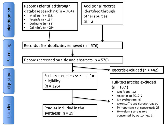 According to the World Health Organization, primary health care is “essential care based on practical, scientifically sound and socially acceptable methods and technology made universally accessible to individuals and families in the community (…) It is the first level of contact of individuals, the family, and the community with the national health system” [22]. Several studies showed that the integration of primary care in the management of homeless people improved the diagnosis and the treatment of chronic diseases, improved the care experience for homeless people, and reduced the emergency and inpatient hospital admissions [23,24]. However, it is necessary to deepen the knowledge about programs in primary care which could be useful for homeless people. Some high-quality literature reviews already evaluated interventions to improve health or access to health care for homeless people [12,25,26,27,28,29,30]. The interventions presented in these reviews were various and only a few of them described or evaluated primary care organizations or interventions. The lack of high-quality studies led by programs in primary care for homeless people explained why these systematic reviews, which included only moderate and high-quality articles, contain only a few studies that focus on this topic.