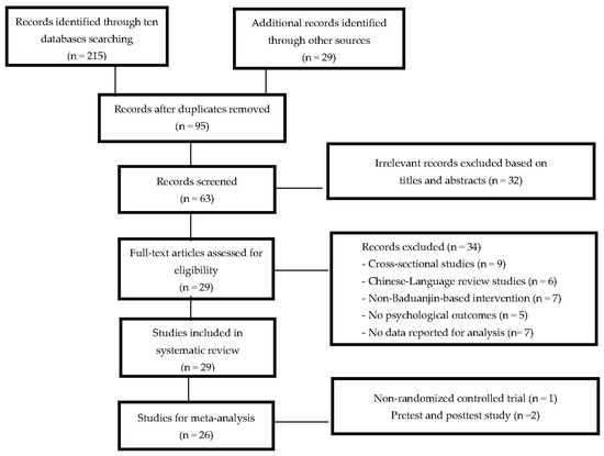 Figure 1 shows the flow of our literature search and selection process. After both electronic and manual searches, 244 articles were initially identified. One hundred and forty-nine were excluded because they were duplicates. Based on the titles and abstracts of the remaining articles, 32 irrelevant records were excluded. According to the inclusion criteria, 34 full-text articles were excluded because of the following reasons: (1) cross-sectional studies (n = 9); (2) Chinese-language review studies (n = 6); (3) No Baduanjin-based intervention (n = 7); (4) no psychological outcome (n = 5); (5) unobtainable data for meta-analysis (n = 7). Our searches resulted in 29 eligible studies, including 26 RCTs, 1 NRCT, and 2 PPS. Only RCTs were considered for meta-analysis in the present study.