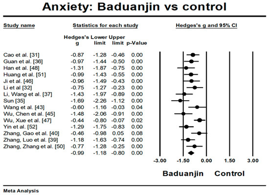 While mean effect size was −1.03 (random-effect model), one study [49] reported large effect size (Hedge’s g = 2.63) beyond 2 SD. Additionally, Chan [27] reported a relatively small effect size (Hedge’s g = −0.47) with large sample size. The funnel plot also indicated significant asymmetry (Egger’s regression intercept = −6.698, p = 0.001). While these two outliers were removed for further analysis, the funnel plot of remaining studies showing no significant asymmetry (Egger’s regression intercept = −5.32, p = 0.063). For the meta-analysis, the 15 remaining RCTs examined the effects of Baduanjin versus control group on anxiety measured by different instruments. A higher negative value (effect size) for all anxiety-related tests indicates greater reduction of anxiety level. The aggregated result has shown a significant benefit in favour of Baduanjin on anxiety (a large effect size, but moderate heterogeneity: Hedge’s g = −0.99, p < 0.001, I2 = 55.41%) (Figure 2).