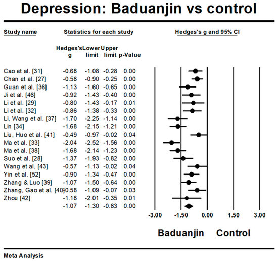 Four studies reported large effect sizes beyond 2.5 SD above the mean effect size (Hedge’s g = −1.49), which are as follows: Hedge’s g = −4.79 [30], Hedge’s g = −3.12 [39], Hedge’s = −2.79 [35], and Hedge’g = −2.76 [45]. While these four studies were included for meta-analysis, the funnel plot indicated significant asymmetry (Egger’s regression intercept = −9.086, p = 0.009). Thus, we removed these four outliers for further analysis. The funnel plot of the remaining 17 studies showed no significant asymmetry (Egger’s regression intercept = −2.634, p = 0.317). For the meta-analysis, the 17 remaining RCTs examined the effects of Baduanjin versus control group on depression, measured by different instruments. A higher negative value for all depression-related tests indicates greater reduction of depression level. The aggregated result has shown a significant benefit in favour of Baduanjin on depression (a large effect size, but moderate heterogeneity: Hedge’s g = −1.07, p < 0.001, I2 = 74.24%) (Figure 3).