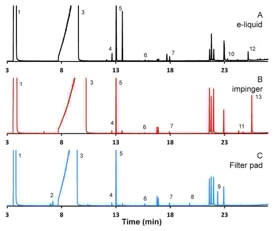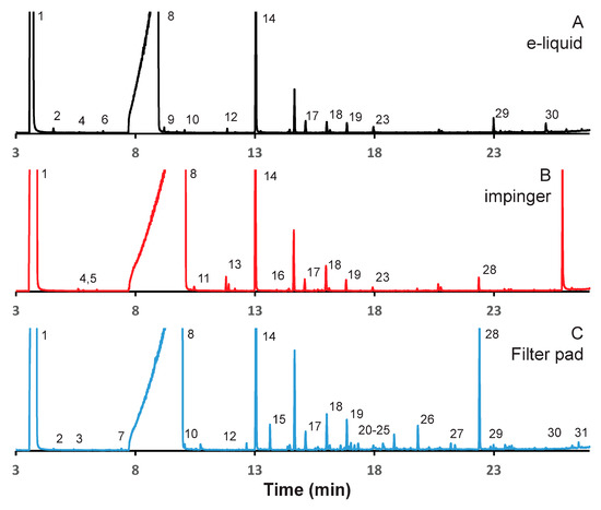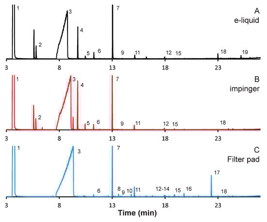 Gas chromatogram (GC) analysis of aerosol emissions resulting from mango flavored e-liquid using alternative captured methods. Emissions were collected from 100 puffs under realistic topography conditions. Chromatograms reflect (A) e-liquid diluted in methanol, and emissions collected: (B) with series impinger 1; and (C) on 10 Cambridge pads, with 10 puffs per pad.