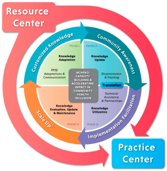 Once the adapted knowledge has been developed and disseminated, NCHPAD helps strategic partners implement the inclusive PPSEs. Strategic partnerships at both a local and national level are vital in order to act upon the social determinants of health [33]. Building community capacity by sharing resources, knowledge, and forming networks, as in Phase 2, is an effective method to provide services and promote health [34]. These active, sustained networks of partners are key in order to address the complex factors that influence health behaviors and outcomes for people with disabilities [34]. However, to promote action on and the use of the resources and knowledge disseminated, NCHPAD works with partners to help facilitate their uptake of adapted, inclusive PPSEs and resources.