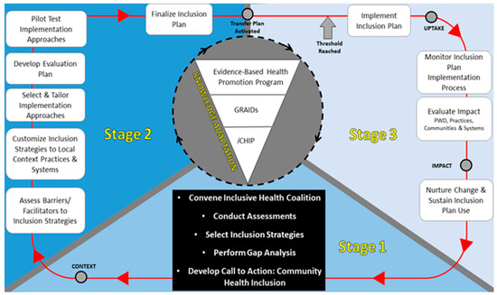 To facilitate the practice of inclusion in organizations and communities, NCHPAD utilizes an adapted version of CAN-IMPLEMENT, an evidence-based model that was developed to support the implementation of evidence-based guidelines [36]. The NCHPAD iCAN-IMPLEMENT (inclusive CAN-IMPLEMENT) Process [24] (Figure 2) consists of three stages and multiple steps within each stage to guide the use of inclusion strategies in communities and organizations. The stages are: (1) Identifying the specific inclusion problem(s); (2) Developing the solution; and (3) Implementation, evaluation, and sustaining inclusive practices. The process and outcomes documented by partners who use the NCHPAD iCAN-IMPLEMENT process will help build the evidence-base around inclusion practices.