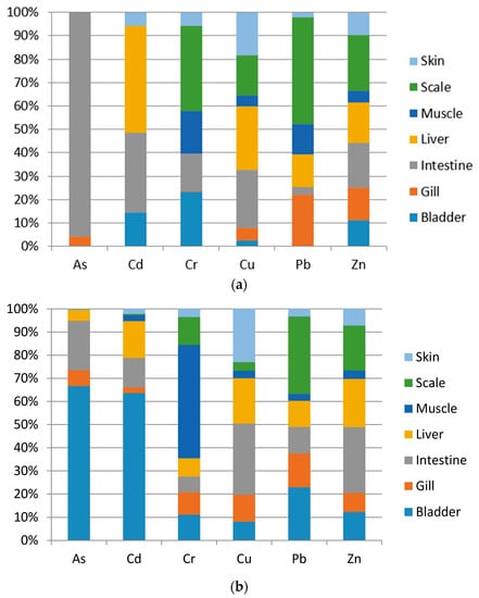 With respect to the distribution comparison among different fish tissues, scales (MPI = 3.342) and liver (MPI = 1.276) were regarded as the main accumulation tissues for cultured fish. As could only be detected in cultured fish intestine and gill, Cd and Cu accumulated mainly in cultured fish intestine and liver, Pb and Cr accumulated mainly in scales, and Zn accumulated evenly in scales, intestines, liver and gills. For wild fish, the bladder (MPI = 0.640) and intestine (MPI = 0.477) were regarded as the main accumulation tissues for wild fish. As and Cd accumulated mainly in wild fish bladder, Cr accumulated mainly in wild fish muscle, Cu and Zn accumulated mainly in intestine and liver, and Pb accumulated mainly in scales and the bladder. To summarize, in both cultured and wild fish, Cu accumulated mainly in the intestine and liver, and Pb accumulated in the scales. This conclusion shows consistency with the results of previous studies [,]. Fish can accumulate trace elements through ion exchange with the aquatic environment (like water and sediment) and food ingestion (like water grass, plankton, and feed) [,]. The main accumulation tissues for cultured fish were the scales and liver, and for wild fish, the bladder and intestine. This conclusion may reveal that the heavy metal concentration in an aquatic environment may influence cultured fish more than wild fish, and the heavy metal concentration in fish food more than in wild fish. To demonstrate this conclusion, aquaculture water and sediment, lake water and sediment, plankton, typical grass and artificial feed can be included in the investigation subjects for further studies of trace element distributions.