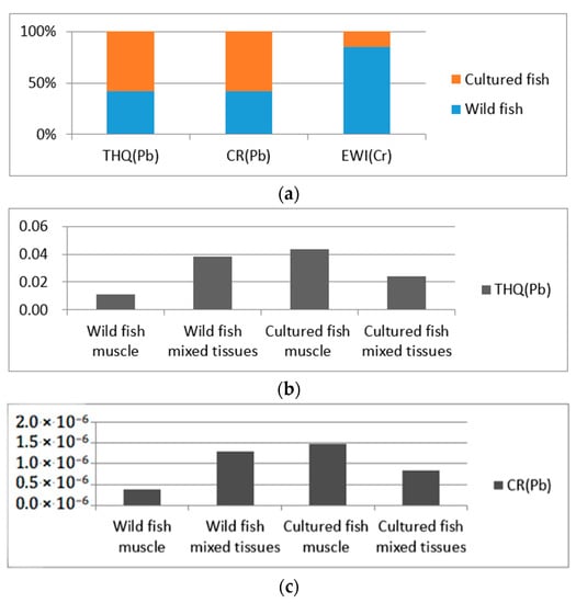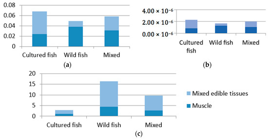 Figure 3a shows that cultured fish was associated with more health risks than wild fish based on the calculation results of THQ and CR, and wild fish was associated with more risk than cultured fish based on the calculation results of EWI. Figure 3b–d shows that in cultured fish, muscle consumption had higher potential health risk than mixed edible tissues, based on the calculation results of THQ, CR and EWI. However, in wild fish, mixed edible tissues had higher potential health risk than muscle.