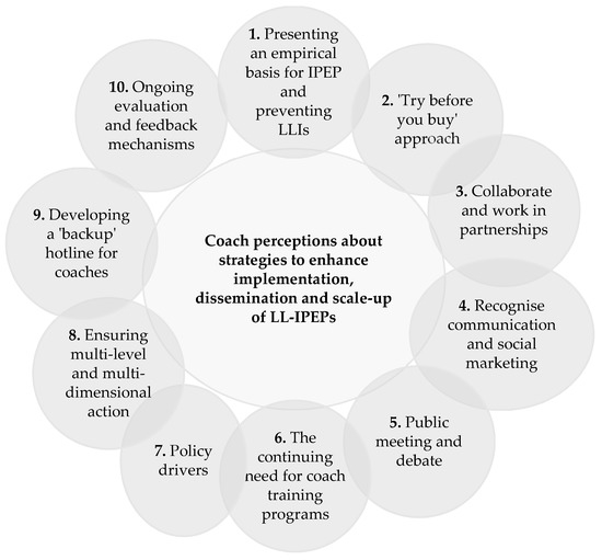 Coach perceptions about strategies to enhance implementation, dissemination and scale-up of LL-IPEPs: lower-limb injury-prevention exercise programs. LLIs: lower-limb injuries.
