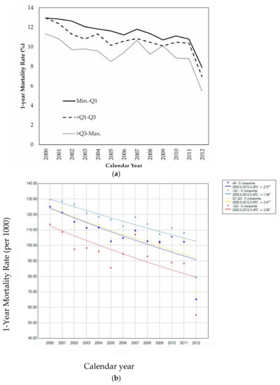 (a) Secular trend in socioeconomic disparity of one-year mortality rate from 2000 to 2012. (b) Jointpoint regression models estimating the annual percent change across the study period.