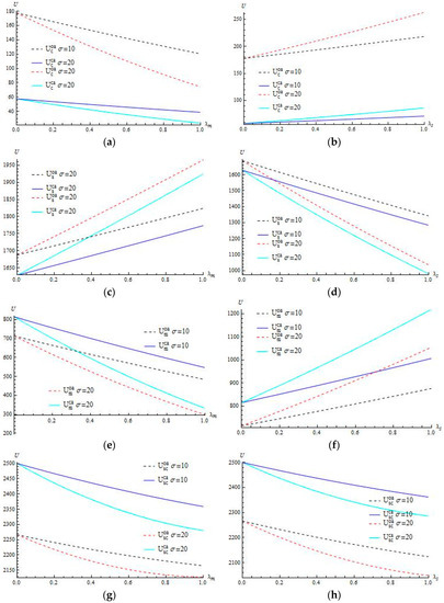 The impact of risk-aversion levels on utilities of chain members. (a) Comparing and as varies when ; (b) Comparing and as varies when ; (c) Comparing and as varies when ; (d) Comparing and as varies when ; (e) Comparing and as varies when ; (f) Comparing and as varies when ; (g) Comparing and as varies when ; (h) Comparing and as varies when .