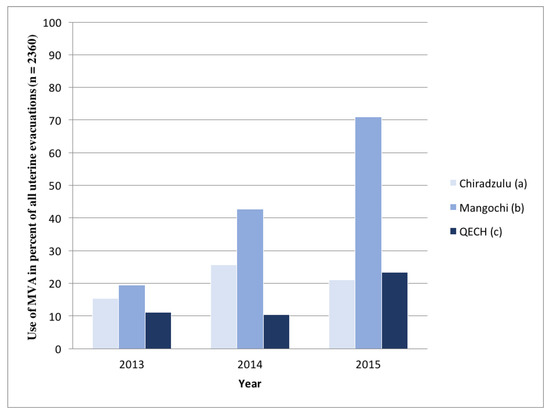 Use of manual vacuum aspiration (MVA) for removal of retained products of conception in first-trimester incomplete abortions, by year and specific Malawi hospital (2013 to 2015). (a) Chiradzulu District Hospital; (b) Mangochi District Hospital; (c) Queen Elizabeth Central Hospital.