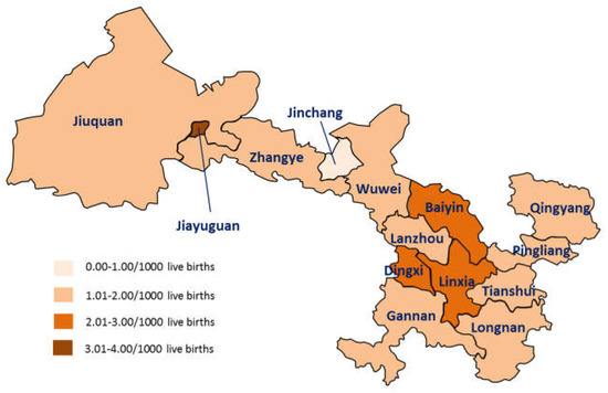 - Cheng, N.; Bai, Y.; Hu, X.; Pei, H.; Li, Y.; Zhang, W.; Fan, X.; Zhang, P.; Zhou, X.; Chen, Z.; et al. A base-line survey on birth defects in Gansu province, West China. Ann. Trop. Paediatr. 2003, 23, 25–29. [Google Scholar] [CrossRef] [PubMed]