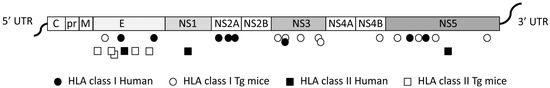 Schematic representation of class I- and class II-restricted cross-reactive Zika virus (ZIKV) epitopes identified in humans and transgenic mice. The ZIKV genome is not to scale. E: Envelope; HLA: Human Leukocyte Antigen; M: Protein M; NS: Non-Structural Proteins; pr: Precursor; Tg: Transgenic; UTR: Untranslated Region.