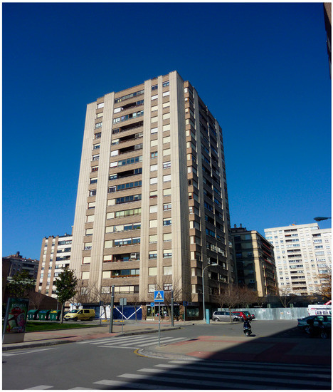 Our collective housing is typical on a general level, as an inheritance of the postulates of the Modern Movement. The lack of developed land in the 1960s and the limited time to cover the new residential needs implied that the edification in height, after five floors would be most usual. Pamplona has 90.175 dwellings, which 48.050 within 1940–1980 periods that is approximately 53%. Moreover, the single-family implied 3% vs. 97% collective home [77]. In Spain, we had at our disposal 25,200,000 million homes according to the last census of 2011 [78]. In which 70% are of first home and a 30% as second home. It is rated that 15% of homes are vacant. Moreover the dwellings built between 1940 and 1980, had the highest potential for renovation as they made up 56% of the total. The European research project TABULA, Typology Approach for Building Stock Energy Assessment; establishes different residential typologies for each country [79]. Mainly we can discern between the single-family house and the collective building. The percentage of collective dwellings in Spain gets at 75%, and it is similar to several countries like Italy, Germany, France, Poland, and Sweden, where the portion of this typology is more than 50%. Therefore, our study case is within this group, so it is representative. Figure 1 below shows a tower’s photo.