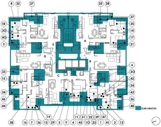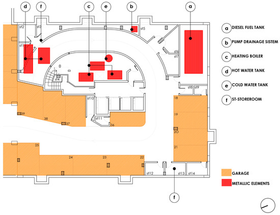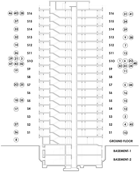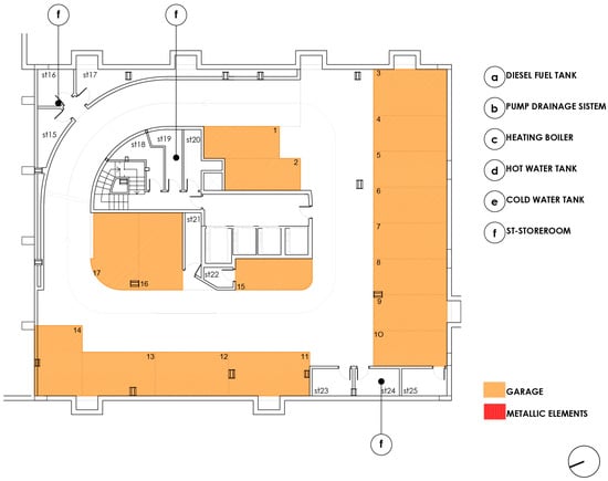 The building is a tower with two basement floors, a ground floor and 16 floors (1 to 16), with five dwellings per floor. The dimensions of the floor plan are 29 × 24 m. The central communications core includes three elevators and a forklift, next to the common stairs of the building. The ground floor is intended for pedestrian and road access, three possible commercial areas and housing for the custodian. The parking and the facilities room are located in the basement floors (−1, −2). Figure 2 below shows the floor basement −2, there are, in addition to the parking spaces for vehicles, the boiler room with hot water tanks, and a metal fuel tank. There are three water tanks and three boilers around the central core.