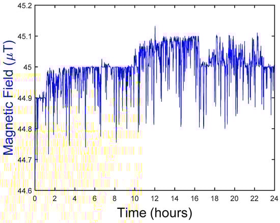 Therefore, from the geomagnetic field point of view, this is the sum of an internal field due to the action of the Earth as a permanent magnet and an external field generated in the environment by factors such as atmospheric and solar activity. The Earth’s internal magnetic field has its origin in the electric current, which circulates through the upper layer of the Earth’s core [50]. The daily fluctuation of the Earth’s magnetic field is from 10 to 100 nT [51]. The main field varies slowly over time and can be described by mathematical models such as the International Geomagnetic Reference Field and World Magnetic Model (WMM) [52].