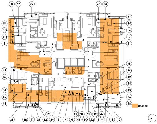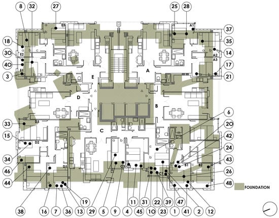 The data collection was arduous due to the necessary authorizations for access and data protection. All requirements for this study were satisfactorily achieved for 48 dwellings. After obtaining and analysing the project and site management documentation, we visited the common areas of the building and each dwelling together with each owner. The section and all the floors of the building were drawn up according to distribution, use, structure, and facilities. Each type of use pertaining to the bedrooms was superimposed by layers, and the overlap along the same vertical (Z direction) was analysed for all floors. The duration of the measurement in each dwelling was 24 h. Although other studies have used other geomagnetic field measurement systems in bedrooms [71,72] we selected the NFA1000 3D geo-magnetometer by Gigahertz [73], with a non-electroconductive tripod with a terrestrial magnetic field sensor and a compass to obtain the vertical cross-section.
