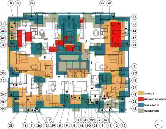 This urban neighbourhood was planned with large blocks, where interior landscaped spaces alternate with residential buildings with a typological tower shape. It is delimited by the neighbourhood of La Milagrosa to the east and the campus of the University of Navarra to the south. The urban planning and topography facilitate the transition of underground streams from the park of the citadel to this neighbourhood. This building has also been chosen due to the construction date and as representative of structural and construction systems in the last two decades of the twentieth century in Spain. The Ministry of Development of Spain has published a national map with the different levels of the geomagnetic field. In Navarra, values of 45.5 µT are indicated. The Observatory closest to our case study is the Ebro Observatory (Latitude: 40.8417 Longitude: 0.45), where graphs of continuous measurement of the Earth’s static magnetic field can be obtained [80]. In Pamplona, the established value is 45.8 µT, although over time, there are increases, which are measured every ten years. Thus, in 1995, the value was 45.2 µT, in 2005, the value was 45.5 µT, and in 2015, the established value was 45.8 µT.