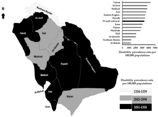 In Saudi Arabia, disability is a significant social and economic problem [9]. The source of national data, and data collections approaches of any disability are little, primarily on aging populations [10]. However, insufficient published studies addressed the epidemiology of disability in Saudi Arabia [9,10,11]. Each type of disability and its severity has particular health, educational, rehabilitation, social, and support needs to help design specific services. The usefulness of such data is limited in Saudi Arabia as the prevalence rates are not suggestive of the overall level of disability [2].