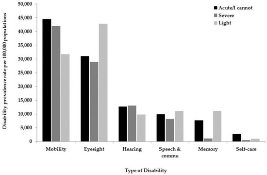Disability prevalence rates per 100,000 populations in 2016 according to the type of disability and severity.