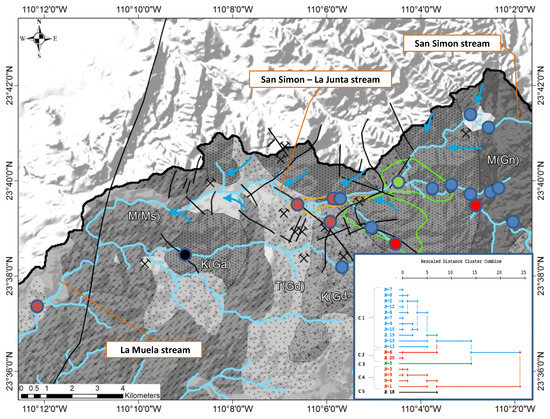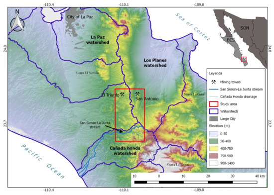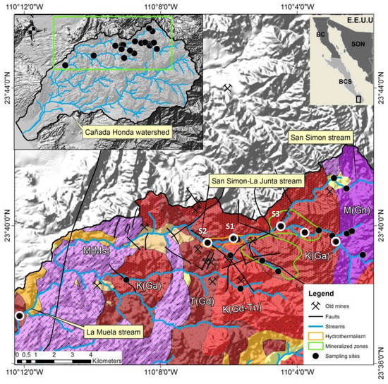 This watershed, with the main drain (La Muela), occupies a total area of 441 km2 and the length of the perimeter is 99.1 km. The angled dendritic drainage system reaches a maximum level of 6 (after the Strahler classification). The study area corresponds to the arroyo (creek) San Simón—La Junta with a length of 22 km and an area of 55 km2, which forms the southern part of the Triunfo-San Antonio mining district, representing the highest part of the Cañada Honda watershed (with a maximum of 1100 m above sea level [3]. After the Strahler classification, the drainage system of this sub-basin reaches a maximum level of 4. The arroyo La Junta flows into the La Muela arroyo, which finally ends in the Pacific Ocean (Figure 1). Like for the rest of the state of Baja California Sur, the riverbeds are dry during most of the year and receive water only after heavy rainfall. The small creeks in the upper parts of the Sierra La Laguna Mountains often depend on temporal springs, which receive water from fractures in the metamorphic rocks during some weeks of the year. Therefore sampling of surface water is limited to a short time span after an important rain event.