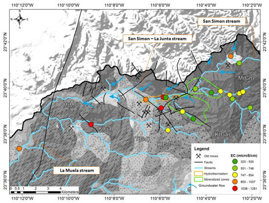 Figure 3. The electrical conductivity measured at 19 sites in the month of October. Blue arrows indicate areas with recognized influx of groundwater into the arroyo (creek) (see Wurl et al. 2014 [26]). Three areas with geochemical anomalies can be distinguished: the mineralized zone (gold, silver, and byproducts like arsenic), the area of hydrothermal manifestations, and the locations of historic mines.