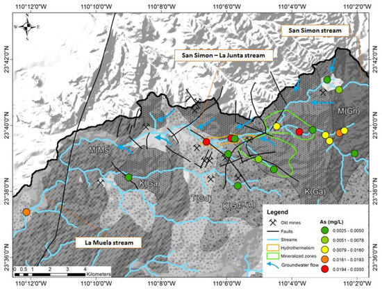 The mineralization of the surface water in the arroyo La Junta rises along the flow path. Although the metamorphic rocks only permit water circulation via fractures, piezometric water levels indicate a general groundwater flow into the arroyo La Junta, which drains the area [26]). The hydraulic connection between groundwater and surface water can be recognized by the changes of the surface water composition, after passing through areas of elevated arsenic concentrations in the groundwater.