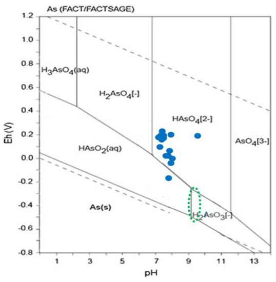 Figure 5. Position of surface water samples in an Eh/pH diagram of the system As–O–H (Astotal = 1 nM, 298.15 K, 105 Pa) from Takeno (2005) calculated with the program FACTSAGE [44]. The position of the green circle indicates the Eh-pH conditions in the thermal groundwater [26].