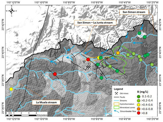 The El Triunfo-San Antonio mining district occures across three watersheds: El Carizal and Los Planes and Cañada Honda, in the southern part. In Cañada Honda the concentration of arsenic (dissolved) exceeded the values established by the World Health Organization of 0.01 mg/L [25]) in 41% of the monitored sites; the maximum concentration, found in one observation well was 0.45 mg/L arsenic [26]. In surface sediments from river banks of the Canada Honda watershed, Sánchez Martínez et al. (2017) [22] reported enrichment factors of 5.3 for arsenic, 2.2 for copper and 1.6 for zinc with respect to average concentration of the continental crust reported by Wedepol (1995) [27]. Groundwater with a hydrothermal component was described at four sites in the central part of the La Junta arroyo (Figure 2). The water type is Na-Cl but only low total mineralization (325–393 µS/cm) is observed with an alkaline pH between 9.3 and 9.6. The concentration of fluoride (1.79–3.25 mg/L) and boron (0.83–9.54 mg/L) are elevated meanwhile Mg and Ca concentrations are low (under 0.2 mg/L and 5 mg/L) respectively [26]. Because the arsenic concentration in these samples was less than 0.008 mg/L, it was concluded that no significant impact of arsenic from hydrothermal fluids was found in the study area.