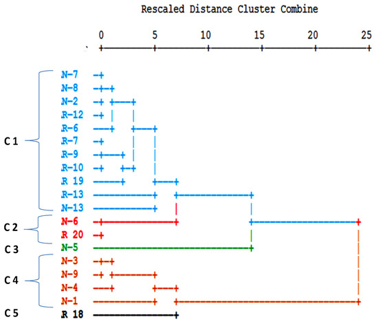Figure 7. Dendrogram of a cluster analysis in Q-mode with the separation of five clusters (C1–C5) at a fusion value of six.