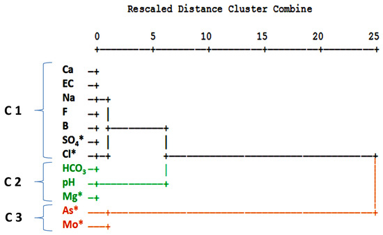 The calculation of the Pearson Correlation Coefficient (r) between the analyzed trace elements revealed no significant correlations (at a significance level (p) < 0.01) among arsenic and any other parameter. In a cluster analysis the following 12 physico-chemical parameters were used: Ca, Mg*, Na, Cl*, SO4*, HCO3, F, B, As*, Mo*, EC (electrolytic conductivity), and pH (*variable was transformed to log10 concentration values). Because the variables have different measurement levels, values are standardized to z scores, with a mean of 0 and a standard deviation of 1. The cluster analysis was performed in Q-mode in order to define sample similarity, and in R-mode to define information similarity from different variables. In the resulting dendrogram in Q-mode, five different clusters could be distinguished at a fusion value of six (Figure 7).