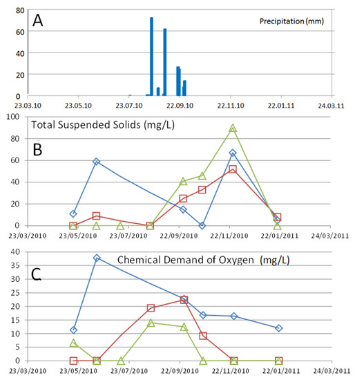 Figure 10. (A) The occurrence of several rain events between the 19 of August and the end of September, with total of 213 mm of precipitation (registered at San Antonio weather station). (B) The concentrations of total suspended solids and (C) the chemical demand of oxygen, observed at the three station in the La Junta arroyo S3 (upstream; green triangles), S1 (middle stream; red squares) and S2 (downstream; blue diamonds) in the month of October.