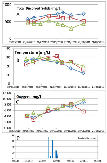 Figure 11. The concentrations of total dissolved solids (A) temperature (B) and dissolved oxygen (C), observed at the three station in the La Junta arroyo (upstream; green triangles), S1 (middle stream; red squares) and S2 (downstream; blue diamonds) in the month of October. (D) The occurrence of several rain events between the 19 of August and the end of September, with total of 213 mm of precipitation (registered at San Antonio weather station).
