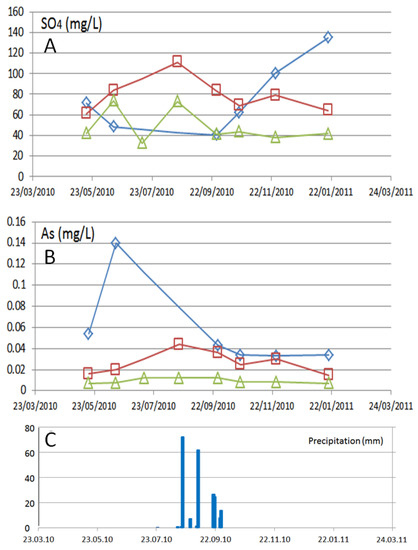 Figure 12. Concentrations of sulfate (A) and arsenic (B) in surface water at the three station in the La Junta arroyo S3 (upstream; green triangles), S1 (middle stream; red squares) and S2 (downstream; blue diamonds) in the month of October. (C) The occurrence of several rain events between the 19 of August and the end of September, with total of 213 mm of precipitation (registered at San Antonio weather station).