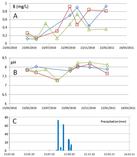 Figure 13. Variation of the boron concentrations (A) and pH values (B) in surface water at the three station in the La Junta arroyo S3 (upstream; green triangles), S1 (middle stream; red squares) and S2 (downstream; blue diamonds). (C) The occurrence of several rain events between the 19 of August and the end of September, with total of 213 mm of precipitation (registered at San Antonio weather station).