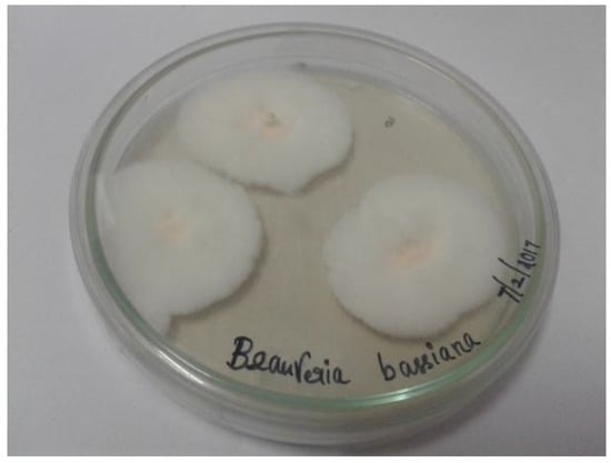 B. bassiana-28 fungal culture was isolated from dead cadavers of Spodoptera litura (tobacco cutworm or cotton leaf worm) insects in a cotton field in Dharmapuri, Tamil Nadu, India. B. bassiana-28 (Figure 1) was sub-cultured on potato dextrose agar (PDA) medium with added ampicillin (3 mg/100 mL) and incubated for 10 days at 25 °C ± 2 °C. B. bassiana-28 fungal culture was maintained and research work was carried out at the Molecular Entomology Laboratory (Salem, Tamil Nadu, India).