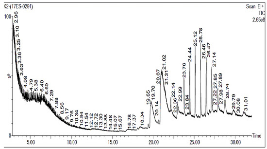 Gas Chromatography-Mass Spectrometry results obtained from the B. bassiana-28 indicated the presence of several major compounds viz. N-hexadecanoic acid (19.695%), eicosanoic acid (21.016%), octadecanoic acid (21.466%), tridecanoic acid (22.081%), pentadecanoic acid (22.136%), tetradecanoic acid (22.986%), octadecanoic acid (23.757%), eicosanoic acid (24.442%), heptadecanoic acid (25.117%), tridecanoic acid (25.778%), octadecanoic acid (26.468%), tridecanoic acid (27.143%), dodecanoic acid (27.888%), l-(+)-ascorbic acid 2,6-dihexadecanoate (28.749%) (Figure 3 and Table 3). Six major compounds—N-hexadecanoic acid (13.6040%), Z,Z-9,12 dectadecadienoic acid (33.74%), 9-eicosyne (10.832%), heptacosane (5.148%), tetrateracontane (5.801%); and 7 hexyleicosane (5.723%)—may be involved in the insecticidal activity.