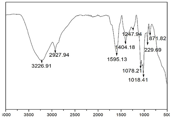 The intracellular ethyl acetate metabolites were illustrated using Fourier transform infrared (FT-IR) analysis (Figure 4; Table 4). The results indicate the presence of bands with peak values at 3226.91; 2927.94; 2858.51; 1595.13; 1404.18; 1247.94; 1078.21; 1018.41; 929.69; 871.82 and 503.42 cm−1 (Table 4). B. bassiana -28 extracts have prominent peaks in the FT-IR spectra at 3226.91 cm−1 corresponding to N–H stretching vibrations. The strong band at 1595.13 cm−1 is assigned to C=O stretching. The two bands at 1078.21 cm−1, S=O stretching and 1018.41 cm−1, C–O stretching, are strong support to the presence of aliphatic and aromatic amines, respectively.