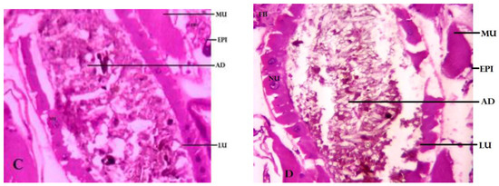 Cross section of Cx. quinquefasciatus larvae untreated and treated with B.bassiana-28 extract Control (A) (untreated) compared with (B) 6 h Treated (C) 12 h treated and (D) 24 h treated, Vacuolated gut epithelium (epi), gut lumen (lu), adipose tissue(ad), muscles (mu), nucleus (nu) and fat body (fb). Larval mid-gut section was stained with haematoxylin and eosin and stained mid-gut tissues viewed and photographed under light microscope at 400× magnification.