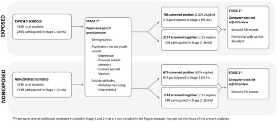 A two-stage (two day) assessment process was used in this study (see Figure 1). During stage 1, all participating students completed a paper-and-pencil questionnaire that screened for psychiatric risks for youth suicide [] (described below in the Measures section). All students who screened positive and approximately 15% of those who screened negative (minimum of 50 students per school) were invited to participate in stage 2, which took place within two days of stage 1. Students screened positive if they met any of the following criteria: (1) responded either “I would like to kill myself” or “I would kill myself if I had the chance” on the suicide item on the Beck Depression Inventory (BDI-IA) []; (2) thought about suicide most days or every day; (3) answered yes to any of the following questions: “Have you thought seriously about killing yourself?” “Are you still thinking about killing yourself?” “Have you made a specific plan about how you would kill yourself?” “Have you tried to kill yourself in the past four weeks?” “Have you ever tried to kill yourself, before the past four weeks?” or “Suicide is a good (or the only) solution to problems”; (4) scored greater than or equal to 13 on the BDI-IA; (5) reported significant drug use or impairment from drugs (e.g., problems in school adjustment, behavior, health, peer relations) based on the Drug Use Screening Inventory []; (6) indicated a desire to see a health professional in response to a question at the end of stage 1; or (7) did not respond to questions about suicide (if they also scored above or equal to 11 on BDI). A total of 708 students screened positive in the exposed schools, of whom 678 (95.8% participation rate) participated in stage 2. A total of 676 students screened positive in the non-exposed schools, of whom 645 (95.4% participation rate) participated in stage 2. Within two days of the completion of stage 1, the responses were scored via an optical scanner. This enabled stage 2 assessments to start within two days of stage 1.