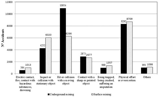 On the other hand, other variables show some clear evidence about the period of the day with the highest incidence, and this is reflected in the percentage of accidents. For example, the Work Hour (WH) with the highest probability of suffering an accident—within the first 2–4 h—suggests that there is a lack of attention due to a meal break, which is usual in this time slot, thus decreasing the concentration level when work is restarted [43]. With regard to the most Typical Accident (TA), whether for surface or underground mining, the immediate cause is body movement with physical effort or overexertion and it is related to the conditions in mines, which often require the use of tools in awkward positions, increasing the risk of injury [39].