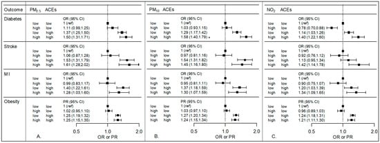 Odds ratios (OR) or prevalence ratios (PR) and 95% confidence intervals (CI) showing the relationship between air pollution, adverse childhood experiences (ACEs) and cardiovascular disease-related outcomes. The three panels show results for three pollutants: (A) PM2.5, (B) PM10, and (C) NO2. Models were adjusted for age, race, sex, urban versus rural zip code, education, income, and employment. For each pollutant and outcome combination, the reference group consists of those participants who had both low air pollution—defined as less than or equal to the 75th percentile—and low ACEs—defined as 0 or 1 ACEs. ORs or PRs for each of the other three exposure groups (high air pollution and low ACEs, low air pollution and high ACEs, and high air pollution and high ACEs) are all presented in relation to the same low-low reference group. For example, the beta coefficients for the analysis of PM2.5 and ACEs on diabetes were: −4.64 + (0.11)a + (0.31)b + (0.40)c, where a indicates the high-low group, b indicates the low-high, and c indicates the high-high group, corresponding to odds ratios of 1.11, 1.37, and 1.50, for the high-low, low-high, and high-high exposure groups, respectively. A p-value < 0.05 (noted with an asterisk) for the interaction term between with PM10 and ACEs was observed for diabetes.