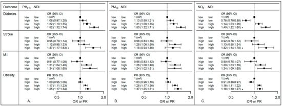 Odds ratios (OR) or prevalence ratios (PR) and 95% confidence intervals (CI) showing the relationship between air pollution, Neighborhood Deprivation Index (NDI) and cardiovascular disease-related outcomes. The three panels show results for three air pollutants: (A) PM2.5, (B) PM10, and (C) NO2. Models were adjusted for age, race, sex, urban versus rural zip code, education, income, and employment. For each outcome, the reference group consists of those participants who had both low air pollution—defined as less than or equal to the 75th percentile—and low NDI—defined as less than or equal to the 75th percentile. ORs or PRs for each of the other three exposure groups (high air pollution and low NDI, low air pollution and high NDI, and high air pollution and high NDI) are all presented in relation to the same low-low reference group. A p-value < 0.05 for the interaction term between air pollution and NDI (noted with an asterisk) was observed with NO2 for diabetes, stroke, and obesity and with PM2.5 for stroke.