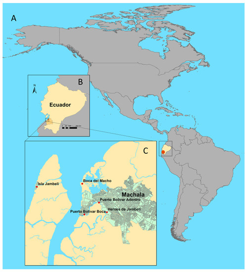 Location of sampling sites. (A) Ecuador (in yellow) in South America, indicating the location of Machala (red point); (B) the location of Machala on the southern coast of Ecuador (red point); and (C) the location of the five sampling sites: Isla Jambelí, Boca del Macho, Puerto Bolívar Boca, Puerto Bolívar Adentro, and Héroes de Jambelí (red points), in and around Machala (green).