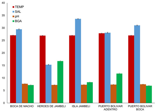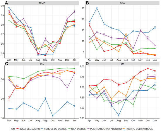 Environmental features in the study period. Water characteristics by month (means and standard errors) and sites: (A) temperature (TEMP, °C); (B) salinity (SAL); (C) measured total concentration of blue-green algae (BGA, cells/µL); and (D) pH.