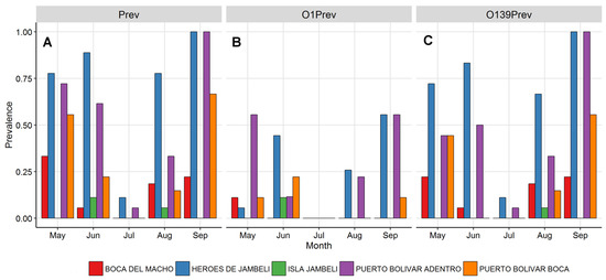 Vibrio cholerae detection. Monthly site prevalence of (A) Vibrio cholerae as given by positive PCR test; (B) O1 strain; and (C) O139 strain.