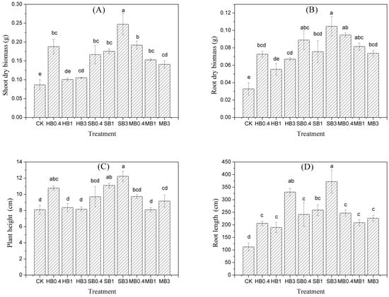 In general, the results (Figure 1) indicated that Cassia alata L. is a potential metal-tolerant plant because it was able to grow on multi-metal mine tailings without any amendments, and the amendments with different biochars had significant effects by increasing the root and shoot biomass and the height and root length of the plants. In contrast to the control group, the different biochar treatments remarkably increased the shoot biomass by factors of 1.2–2.8, except for the HB1 and HB3 treatments. Plants treated with SB presented the highest shoot biomass, and the shoot biomass of plants increased with the amount of added SB. Similarly, the root biomass was enhanced by the biochar treatments, reaching 1.7–3.2 times the biomass of the CK-treated plants, and only the HB1 treatment had no significant effect.