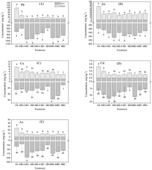 The effects of the different biochar treatments on the concentration of metals in the shoots and roots of Cassia alata L. plants are illustrated in Figure 2. The concentrations of the five metals tested were higher in roots than in shoots. The different biochar amendments reduced the concentrations of Pb, Zn, Cu, Cd and As in the shoot of plants. Compared with the CK group, adding biochar decreased the Pb, Zn, Cu, Cd and As contents in shoots by 63.9–89.5%, 46.9–66.0%, 32.7–62.4%, 40.4–76.4% and 54.9–77.5%, respectively. Among these biochar treatments, plants treated with HB3, SB0.4, MB1, SB0.4 and MB0.4 presented the lowest shoot Pb, Zn, Cu, Cd and As concentrations. However, there were no significant differences in the shoot metal concentrations of Cassia alata L. plants among different biochar addition rates for the same type of biochar.