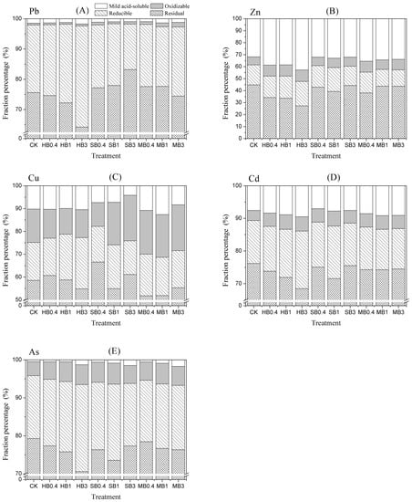 Table 5 and Figure 3 show that the chemical fractionation of Pb, Cu, Cd and As in the mine tailings mainly existed in the residual fraction. The residual fractions in the mine tailing have been considered as inert and inaccessible to biota []. All biochar treatments produced low mild acid-soluble Pb and As contents, which indicated low mobility in the mine tailings. The addition of biochar significantly reduced the activities of Pb and Cu, with the SB treatments decreasing the activities of mild acid-soluble Pb and Cu by 23.4–34.5% and 27.8–59.1%, respectively. In addition, the mild acid-soluble Pb and Cu contents decreased with the rate of biochar addition. In contrast, a difference in the mild acid-soluble Zn, Cd and As contents was observed among the biochar treatments; the mild acid-soluble Zn, Cd and As contents of the HB treatments were 21.3–34.3%, 10.7–25.9% and 6.1–165.3% higher than those of CK, respectively. Most intriguingly, adding MB had the most significant effect on the mild acid-soluble As content, which was 16.4–250% higher than that of CK. Increasing the amount of added biochar stimulated the leaching of As, and the mild acid-soluble As contents of HB3 and SB3 were 2.6 and 3 times the content of CK.